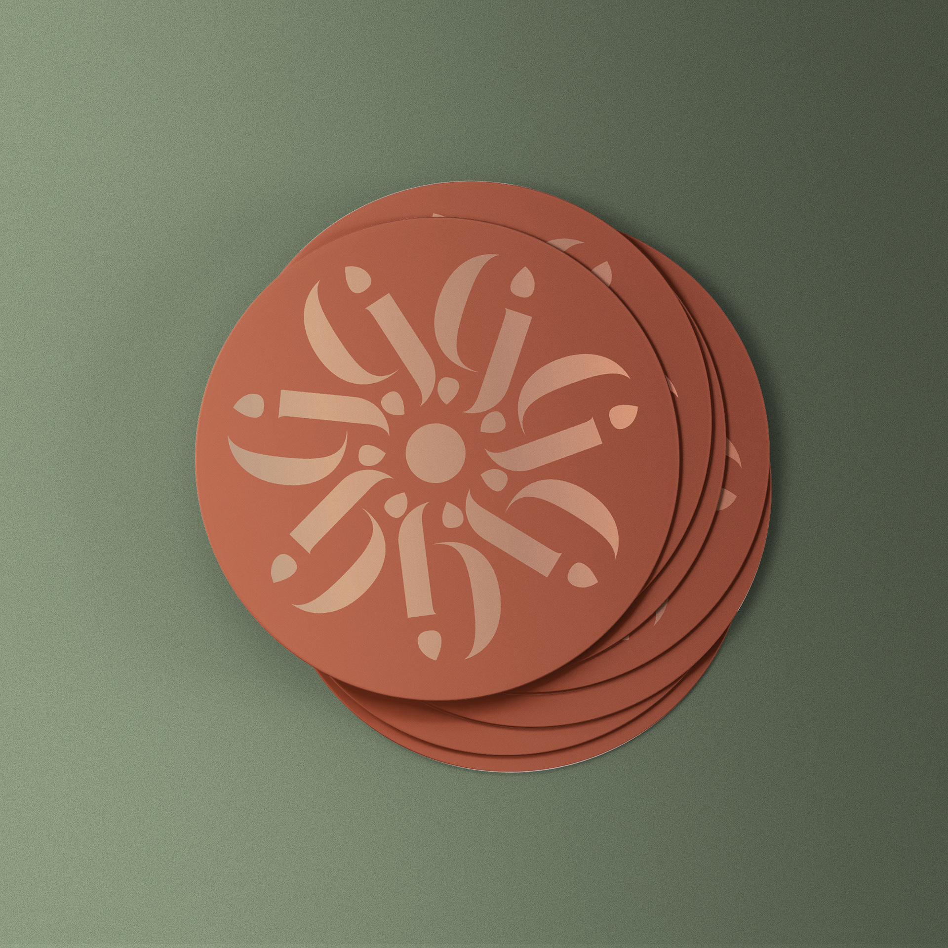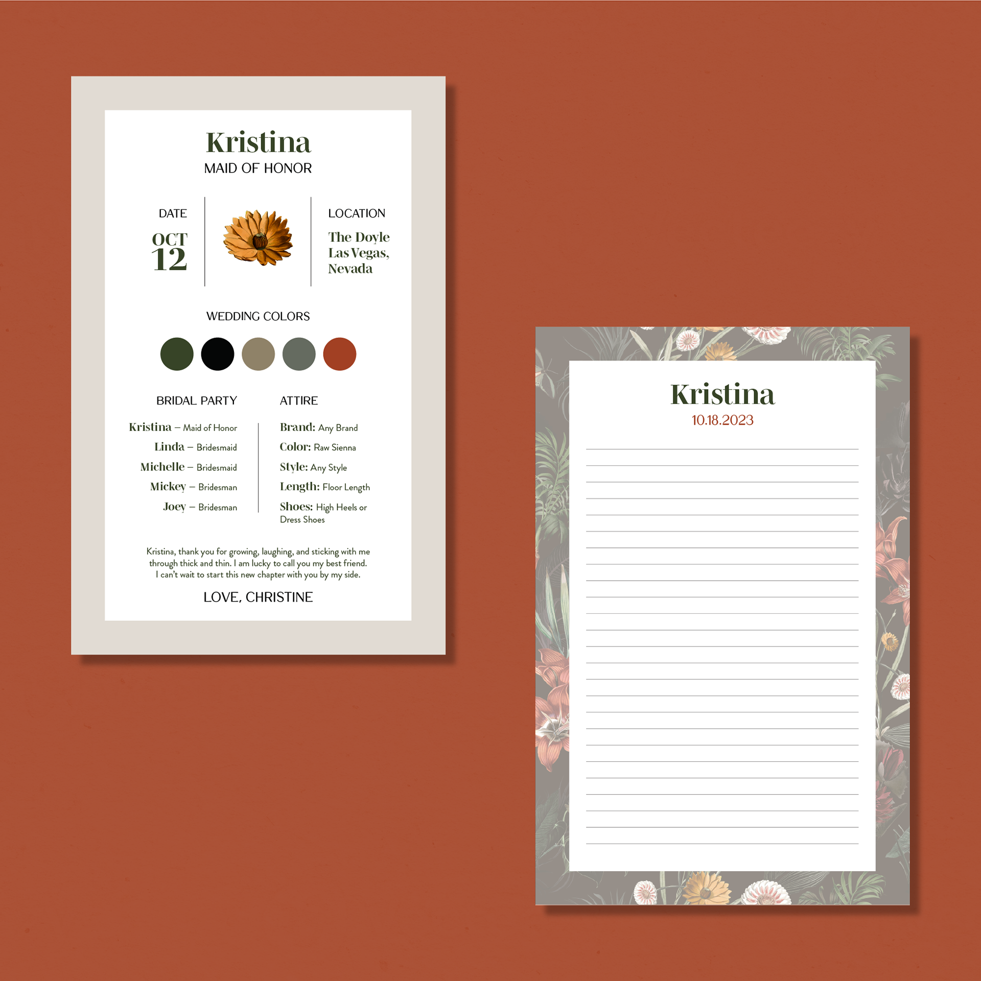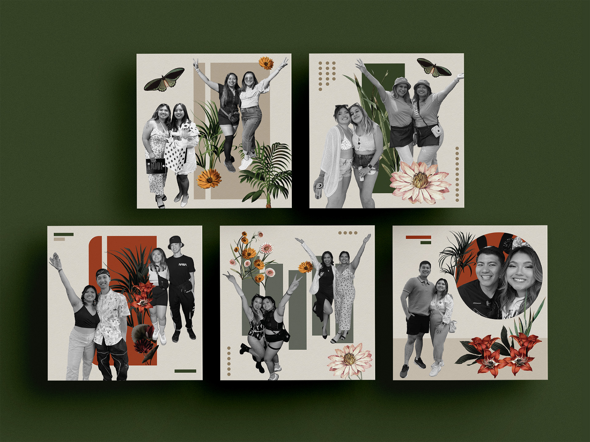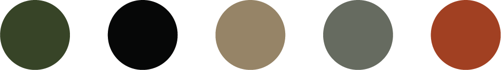 We used a warm color palette consisting of burnt orange, beige, sage green, and forest green.